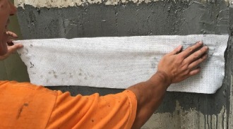 45度角貼不織布,窗框開口四角落黏貼不織布抵抗張力裂縫達到防水效果。