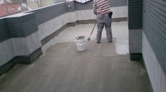 待泥作牆面及磁磚貼做完畢後,防水地坪鋪面施作。
